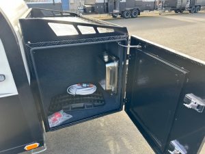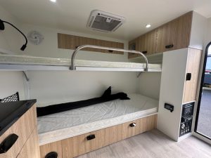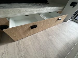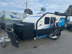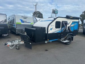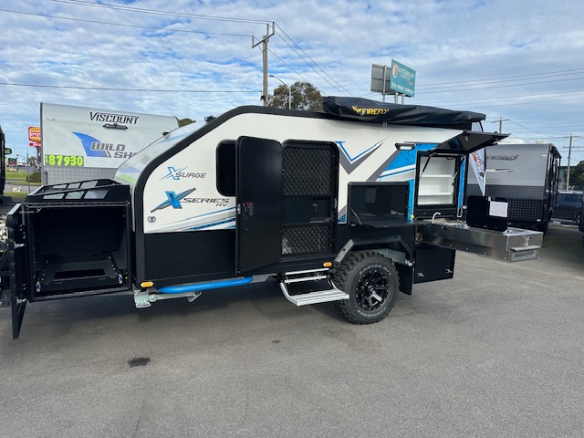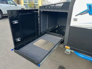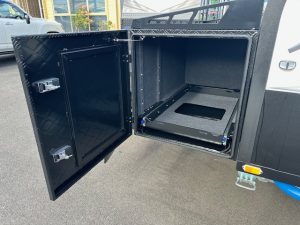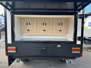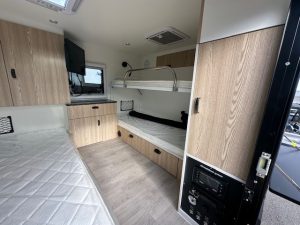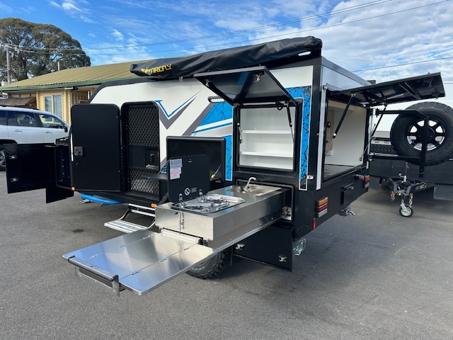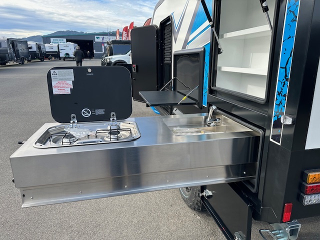 Walking around the Surge this hybrid pod is loaded with all the features! Running on a Independent coil suspension with shockers, a DO35 coupling and lithium system this caravan is packed ready to head off grid. The front toolbox has a large slide to fit a 95L fridge with the other side available for storage. Walking down the side of the caravan you have a picnic table and a pantry locker with a slide out kitchen complete with sink. To the rear of the caravan you have a large lift up dedicated kitchen area with great storage.