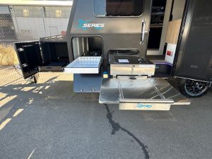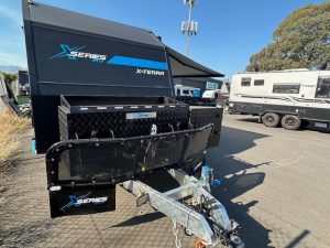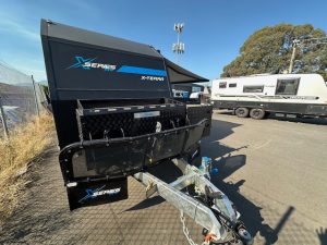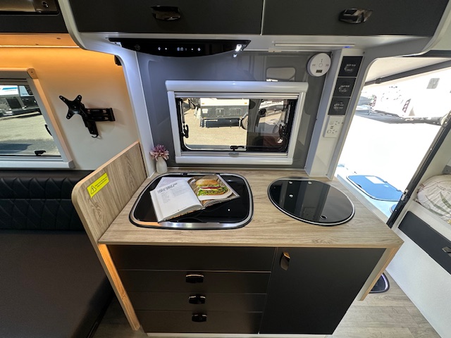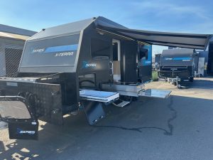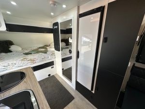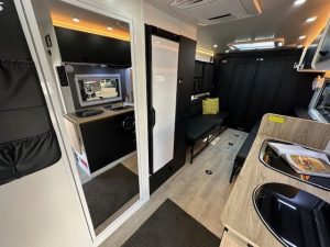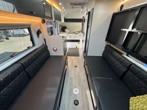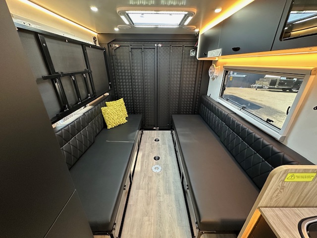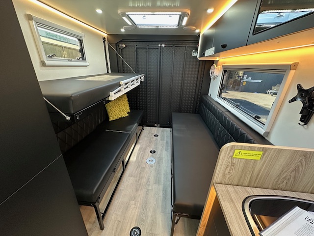 Walking through to the rear of the caravan is two single bed bunks with a removable table so this can be a sleeping space and a meals area. The rear drop down access ramp can double as a sun deck area that can be transformed with an optional annexe to expand further on the living area. The 9 floor mounted tie down points mean you have the space you need for your bikes to come along on the adventure with you!