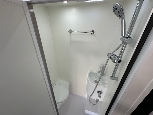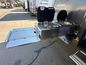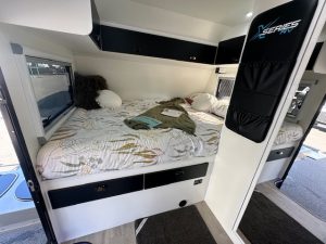 Stepping into this front door layout you have an east west bed to the left with plenty of over head storage. Walking through to the centre of the caravan you have the kitchen complete with 3 burner stove, rangehood, sink and 2 door fridge. Opposite you have a combination shower and toilet.