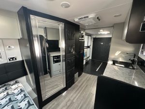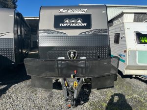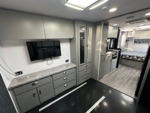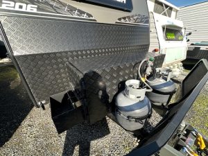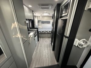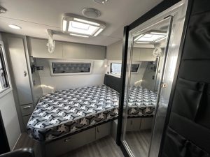 If you check out the features, you will see this van has some serious 12v power, featuring the 200amp lithium battery and a 200watt solar panels, along with 190L of onboard water space and 100L grey water tank for free camping. All ran with a PM300 charger that gives you the ability to see all your tank levels. The extended A-frame will house a great-sized storage box. This caravan is sitting on 3700KG Twin shock independent suspension with 16″ MPC Roman 2 gloss black wheels and a DO45 coupling with high tensile chains. Under the long awning you have a gal-lined tunnel boot, gas bayonet fitting for connecting your BBQ, drop down picnic table and a small marine carpet lined TV entertainment locker.