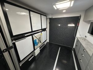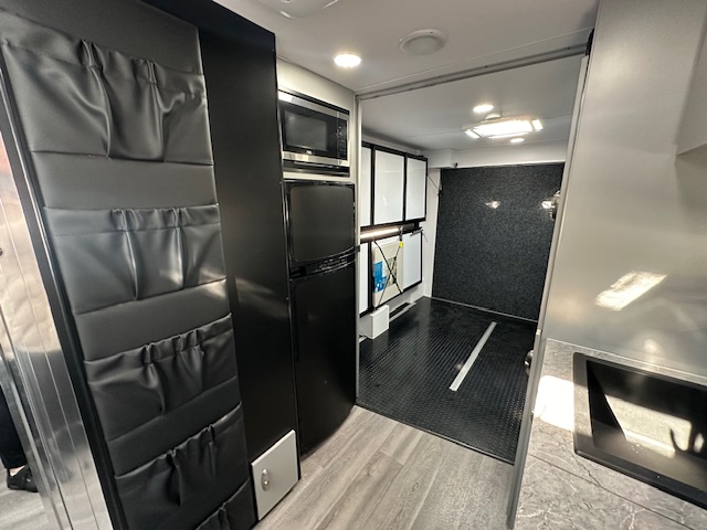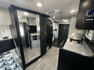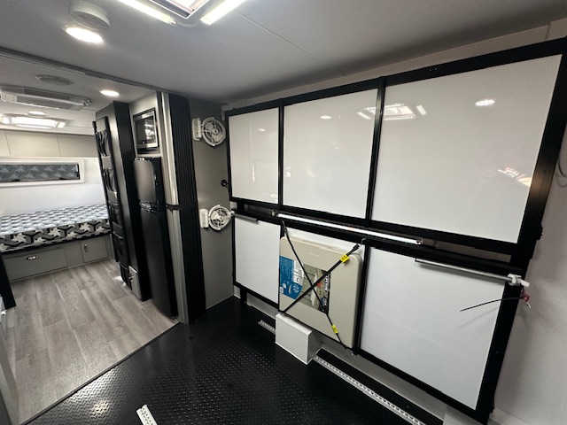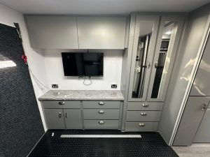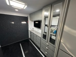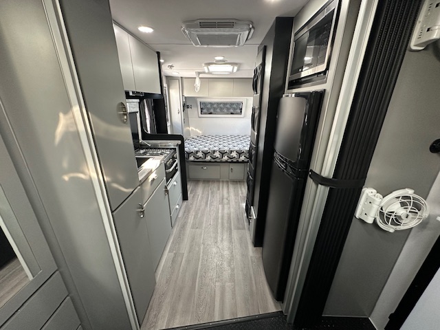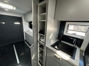 As you walk into the 20’6 Tuff Mudda you will be met with a combination shower toilet behind a glass mirror door complete with a shower, toilet, and sink. To the left your met with a large queen double bed with overhead cupboards, full height robe and sirocco fan. Walking through to the centre of the caravan. You will discover the kitchen, complete with 224L compressor two door fridge freezer. For cooking the caravan has a rangehood, microwave and a recessed mini grill with three gas burners and 1 electric. For a stylish touch you have a black granite sink and black tap ware to complete the modern look for this toy hauler. All furniture is completed in out very popular CNC furniture look.