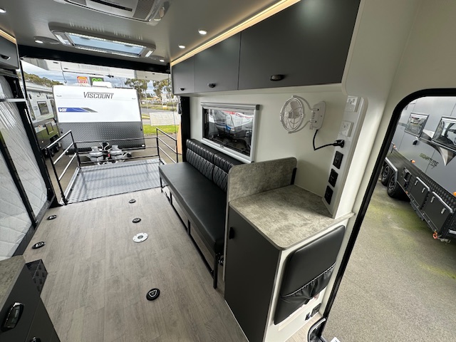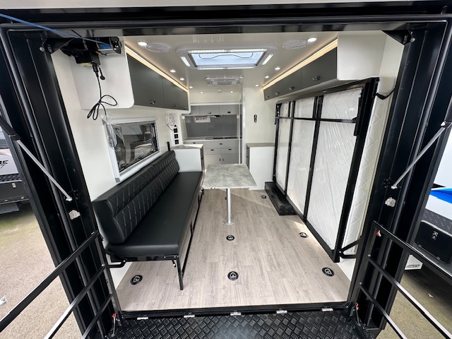 Inside the main cabin you have your main bed. Fold down lounge, mini fridge, ensuite room with toilet and shower as well as storage throughout.