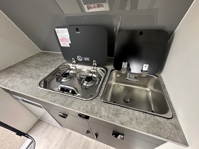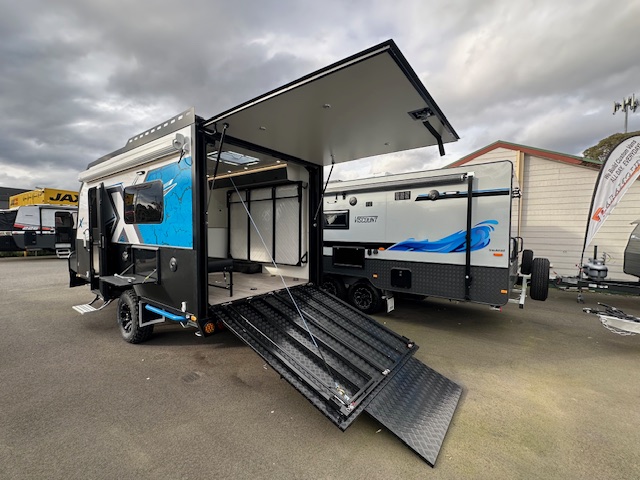 Stepping into the front door layout to the front you have your kitchen with a two-burner cooktop, sink, rangehood and mini fridge. Tucked behind a mirror door is a combo shower toilet. Walking through to the centre of the caravan you have a drop down lounge and removable table with leg. At night you can drop down the double bed to recharge the batteries for an adventure filled day ahead!