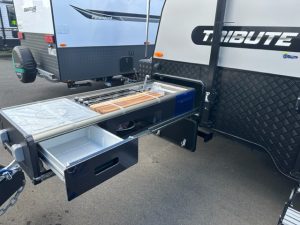 The exterior of the caravan is eye-catching with its Silver Alu-comp exterior. Sitting on a 6″ chassis with a 4-tonne Torflex IRS suspension, 16″ rim, and 12″ brakes. Storage is never-ending from front to back with a galvanised tunnel boot in the front and a large toolbox situated on the A-frame, storage lockers behind the shower in the rear. Set up under the awning is a large slide-out BBQ from the tunnel boot, a picnic table, and a recessed smart TV behind a locker door. This caravan is loaded with premium fixtures and quality unimaginable. For more information on this jam-packed caravan please contact our experienced team for a tour.