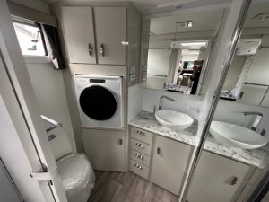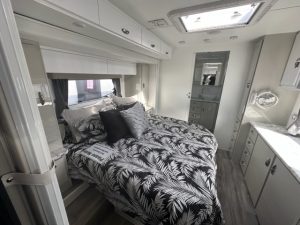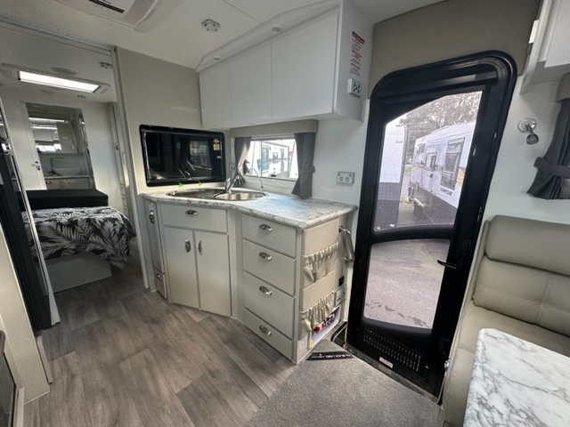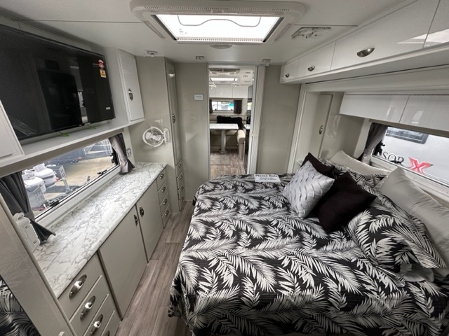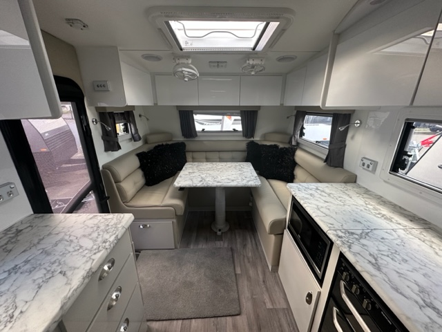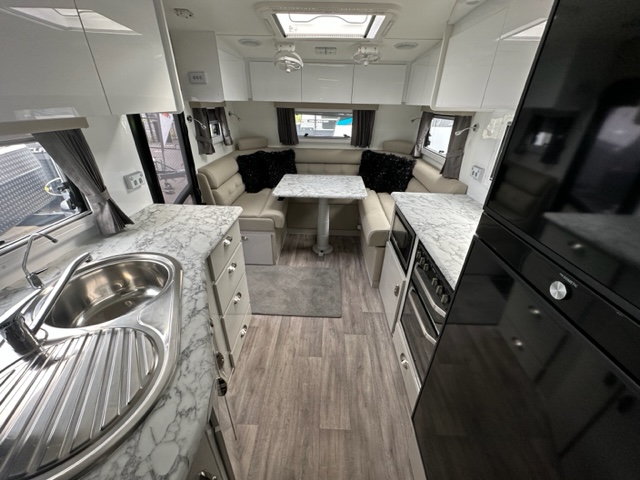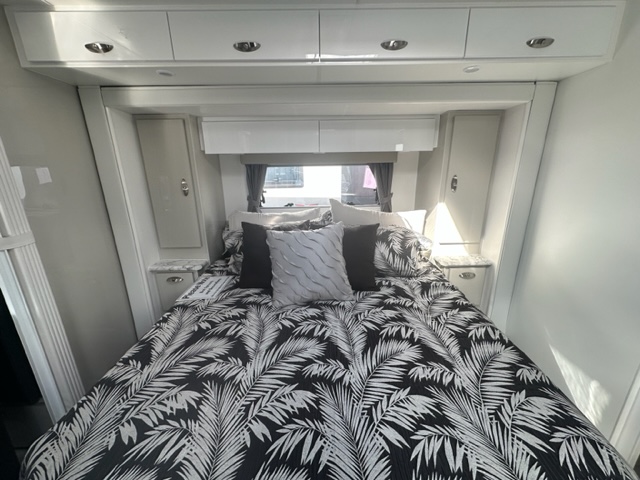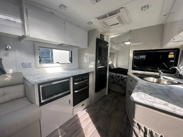 This caravan has been designed and built with all the luxuries you could have dreamt of. Internally you step into the front of the caravan and are greeted with a Grande club lounge at the front with the ability to turn this into an additional sleeping space for any unexpected guests or grandchildren who cannot resist a holiday with the grandparents. This club lounge is wrapped with overhead cupboard storage and two sirocco fans from the ceiling. Stepping further into the caravan you have a galley kitchen with a huge 274L fridge, oven, range hood, microwave, and an angle kitchen with a kitchen sink. A recessed TV is positioned in the kitchen for viewing from the lounge area. The kitchen has a roof-mounted reverse-cycle air conditioner for all-year-round climate comfort. As you walk through the bedroom there is an island lift-up queen bed that slides out the off side of the caravan with a large 40″ TV at the foot of the bed. The whole bedroom has 4 robes and ample overhead cupboards for all your storage needs. The bedroom has two Sirocco fans to provide you with all-night sleeping comfort in warmer climates. Following through to the rear of the caravan is a large ensuite with a front load 4kg washing machine. The caravan is run-off twin 200amp Lithium battery system with 2x200watt solar panels and an inverter system so it reaches off-grid capabilities and takes you beyond your dreams.
