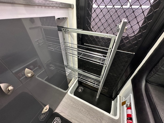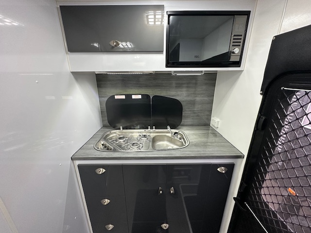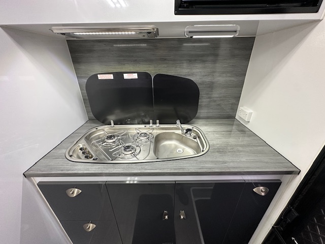 Inside, the Razor XT boasts high-quality finishes and modern appliances. The compact layout includes a comfortable sleeping area, a well-appointed kitchen with a stove top/sink combination, and ample storage through drawers and overhead cupboards. The ensuite features a separate toilet and shower, providing the comforts of home on the road.